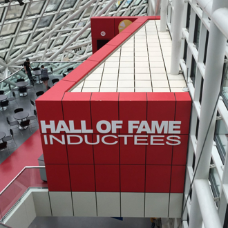 As you enter the great glass pyramid that is the Hall of Fame your senses need to adjust to the various oddities hanging around you from the ceiling. The specific items may vary depending on when you visit, but don’t be surprised to find a giant hot dog, small cars, and anything else that might have been part of a stage show at one time but now requires a large volume of space for display. Not surprisingly, these things tend to be very colorful and they contrast well against the modern white superstructure and glass building enveloping them. In this way the contemporary architecture of the Hall of Fame has so far guaranteed that it itself stays ahead of the collection it houses, and it doesn’t compete with the styles encapsulated by the bands and the music that are featured there.